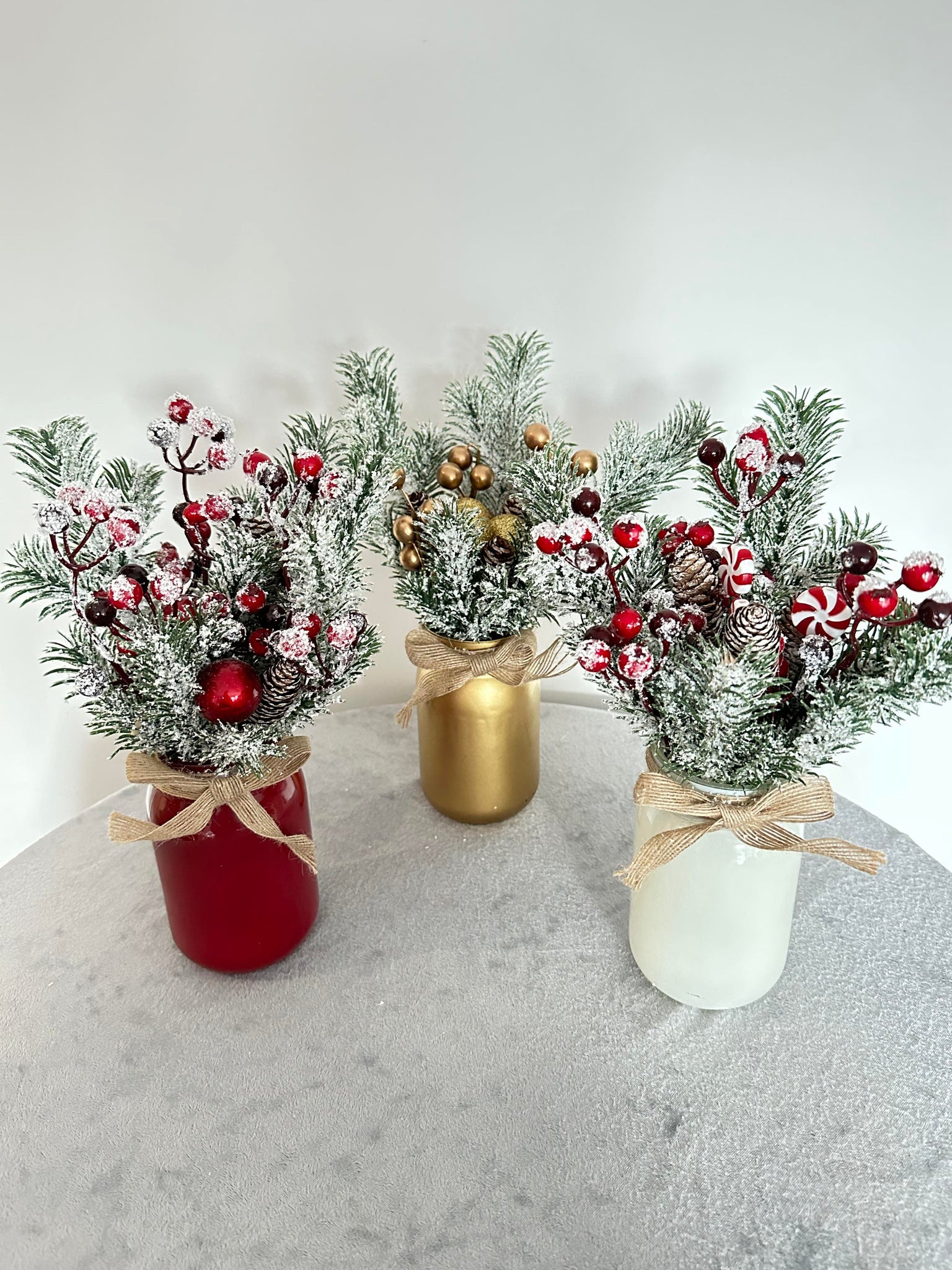 This glass jar centrepieces in white with beautiful snowy fir, christmas berries and foliage .