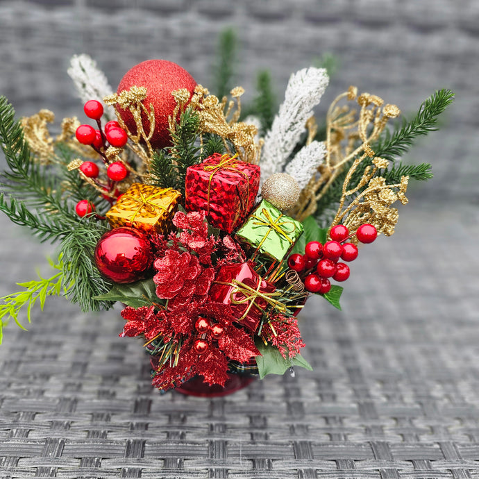 Red Christmas Planter with Festive Foliage and Baubles Mixed Xmas Centrpiece